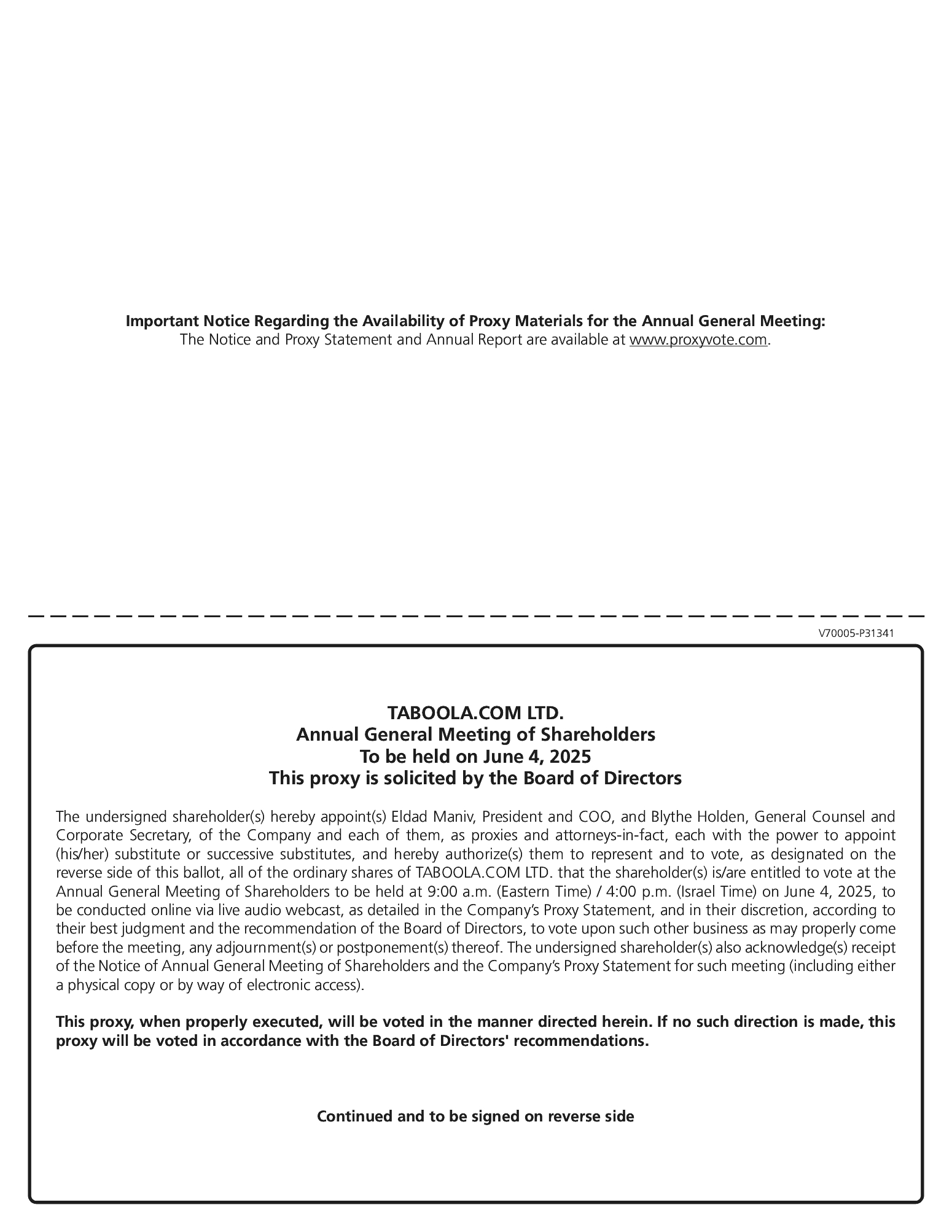 ![]() | Vote by Internet You may vote by Internet prior to the Annual Meeting by following the instructions included with your proxy card or the notice we mailed to you on April 25, 2025 | ![]() | Vote Online at the Meeting You can vote online while virtually attending the Annual Meeting by visiting www.virtualshare- holdermeeting.com/ TBLA2025 | ![]() | Vote by Mail You may vote if you received a printed proxy card, you may mark, sign, date and mail the proxy card you received from Taboola in the postage-paid return envelope. | ![]() | Vote by Telephone You may vote by telephone prior to the Annual Meeting by following the instructions included with your proxy card or the notice we mailed to you on April 25, 2025 | ||||||||||||||