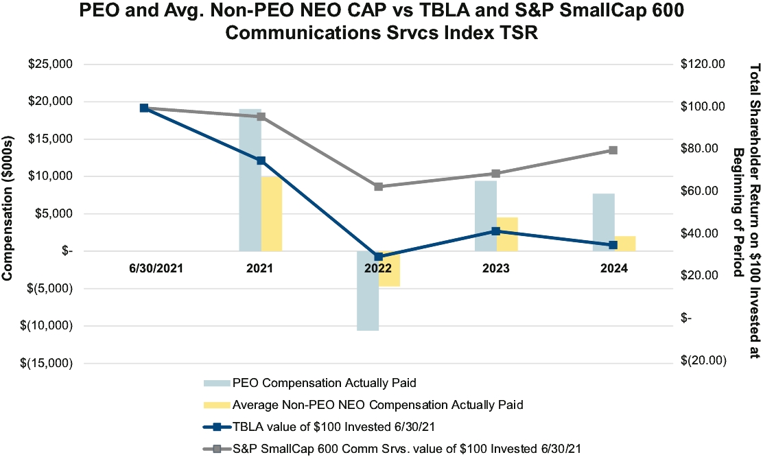 Year | Summary Compensation Table Total for PEO | Compensation Actually Paid to PEO (a)(b) | Average Summary Compensation Table Total for Non-PEO NEOs (c) | Average Compensation Actually Paid to Non-PEO NEOs (a)(b)(c)(d)(e) | TBLA | S&P SmallCap 600 Communication Services | Net Income (loss) (in millions) | Adjusted EBITDA (in millions) $ | ||||||||||||||||||